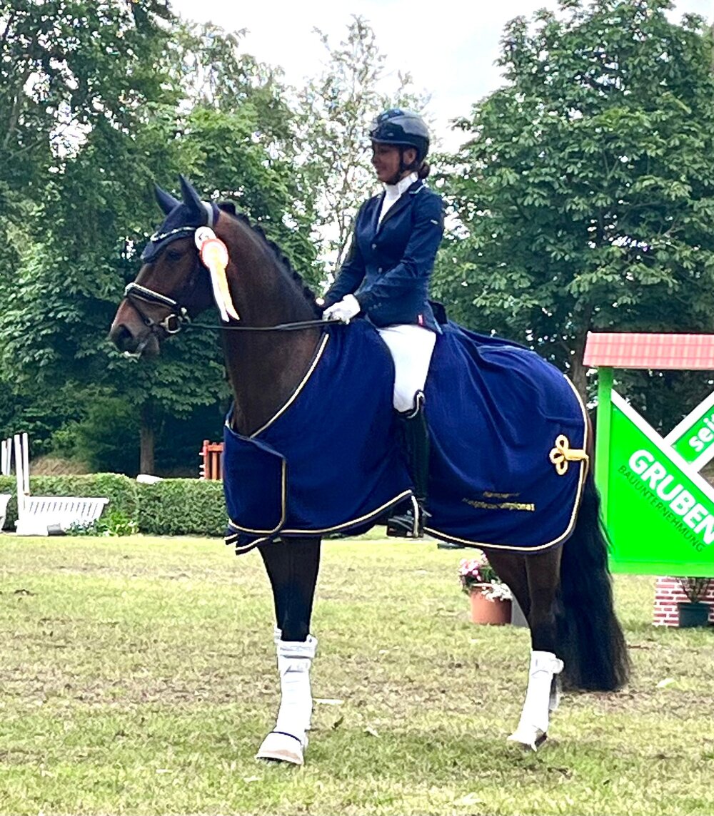 Der vierjährige Wallach von For Dance stammt aus der Zucht und dem Besitz von Gerhard Ikena und wird von Veronika Steinhof vorgestellt! Er gewinnt die Reitpferdeprüfung mit der Wertnote 8,2.