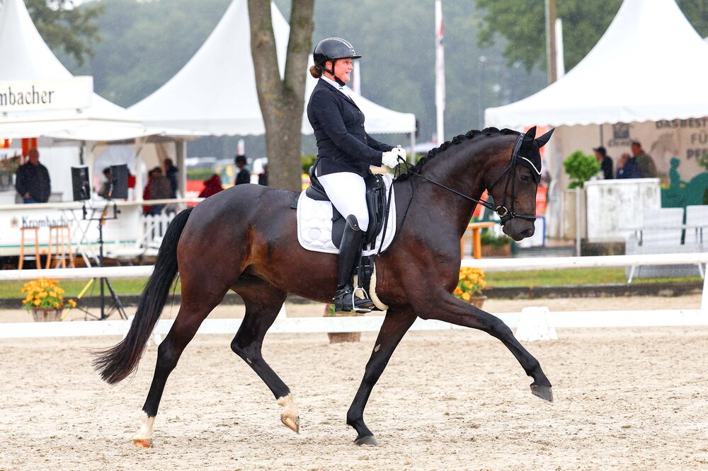 Greta Busacker holt sich den Titel der Vize-Bundeschampionesse der siebenjährigen Dressurpferde mit der Stute Frieda von For Dance - Fidermark. Mit 78.520 % landete das Paar auf Rang 2 in der Dressurpferdeprüfung der Klasse S. Greta Busacker wurde außerdem der Tierschutzpreis für ihre Vorstellung verliehen.