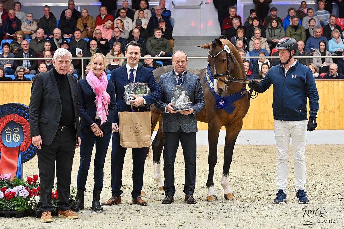 "Dieser Hengst, ein Sohn des Casino Berlin - Toulon, wenn er hier in der Mitte steht, ein ausgesprochen schöner Typ aus erfolgreicher Mutter [...]. Die Bewegung sehr aktiv und schwungvoll. Beim Springen strotzt er vor Selbstbewusstsein, er ist fast ein bisschen arrogant wie er über die Höhen und die Aufgaben, die ihm gestellt werden, lächelt. Er springt mit Leichtigkeit und man hat das Gefühl er könnte noch viel höher."